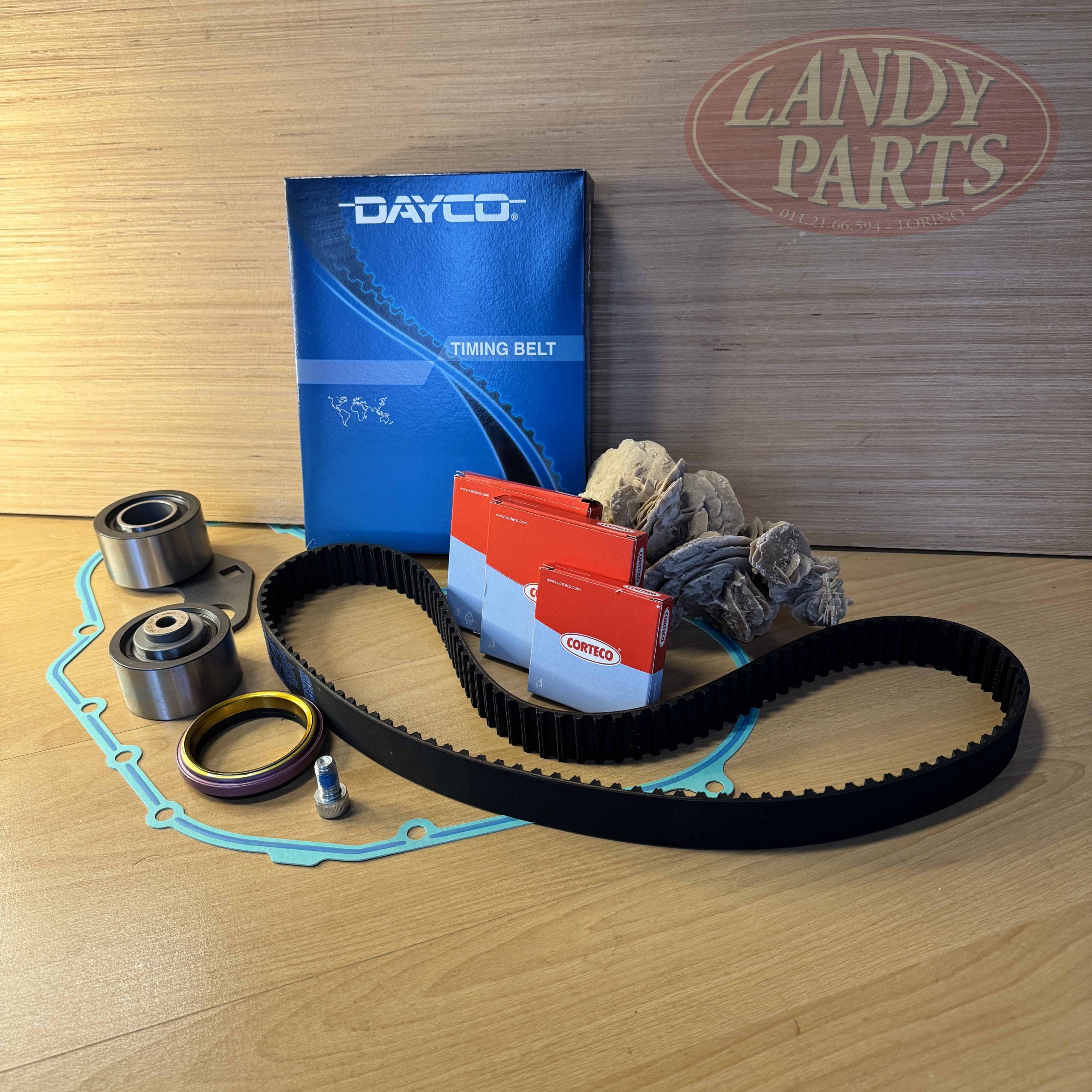 Comprende il tendicinghia, cuscinetto, cinghia, guarnizione coperchio distribuzione e paraoli asse a cammes, albero motore e coperchio.